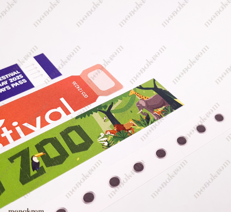 A wristband that is also a ticket, so it stays with you. Made from waterproof material, complete with double tape to stick both ends into a wristband.